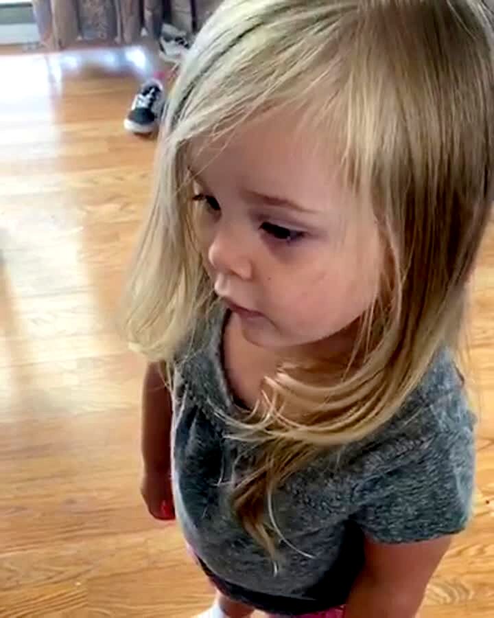 Tot girl makes scary face when asked to show how excited she is for a new baby.