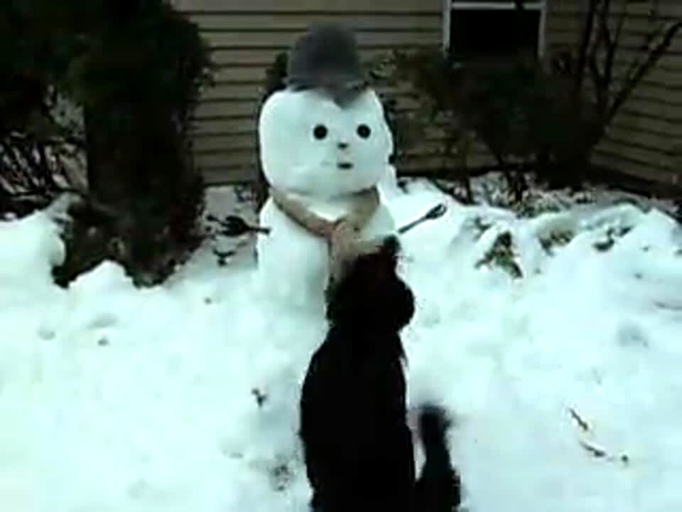 Black dog pulls snowman's scarf off. The head of the snowman comes with it. Winter.
