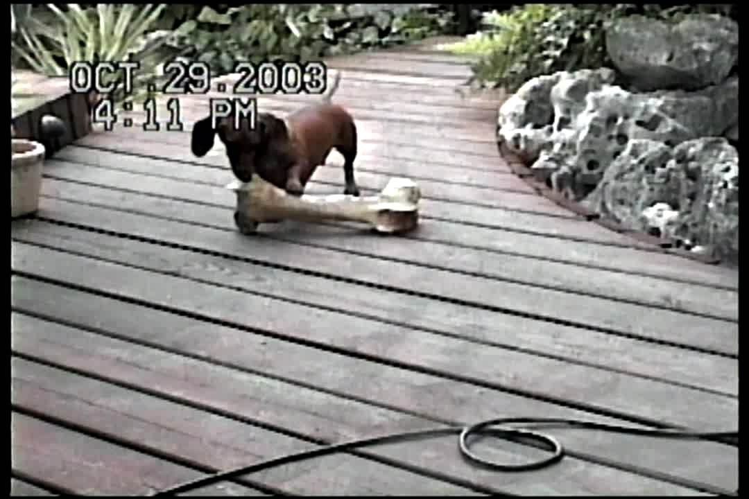 Dog carries bone that is bigger than he is.