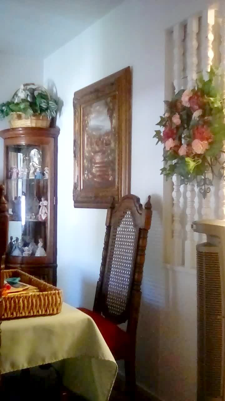 A senior woman walks into a dining room and gives some food to a boy. The camera woman walks up behind her and laughs. The senior woman gets scared. She yells, squawks, and flaps her arms. Short tails.