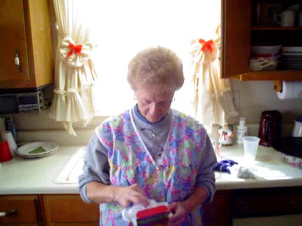 A senior woman tries to eat a snack from her Snack Hat present, but she can't the snacks.
