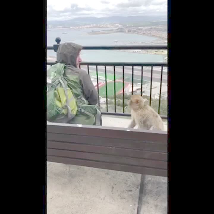 A man on vacation gets chased and scared by a monkey and he hits a view finder as he runs away.