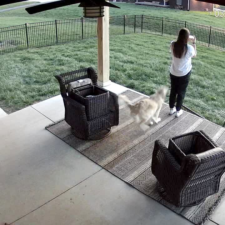 A teen girl practices her footwork for discus in the driveway. She launches it, and it goes over the roof. After a loud crash a car alarms start to go off and the teen runs toward the sound.