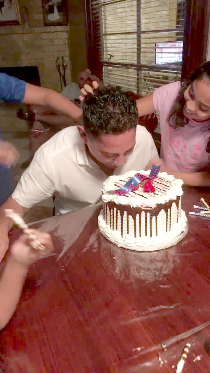 A man uses a plate to block his face when a teen boy tries to smash his head down in to his birthday cake as he leans over it in the backyard.