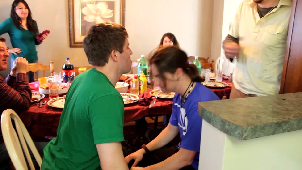 A man tries to push a woman's face into a cake on a dining room table. Instead he slips and his face goes into a pie on the table and he falls down. Featured talent cleared (man and woman jostling with each other).