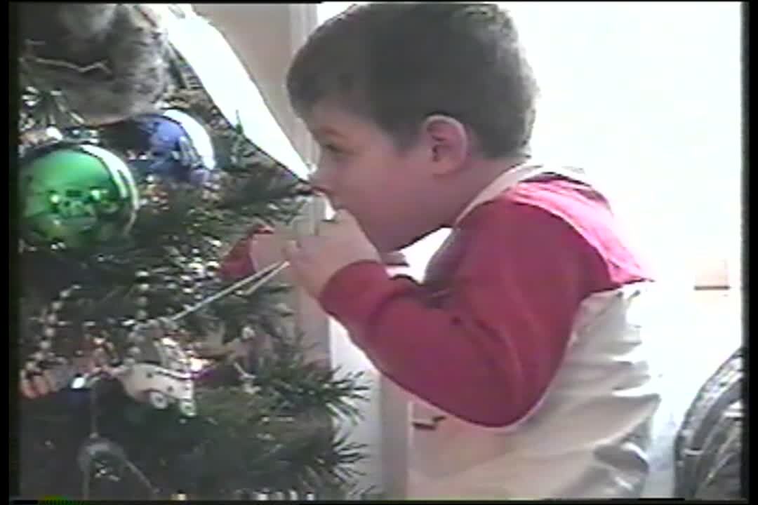 Boy eats Fruit Loops cereal off a string around the Christmas tree. He gets crumbs all over the floor & accidentally bites his own finger.