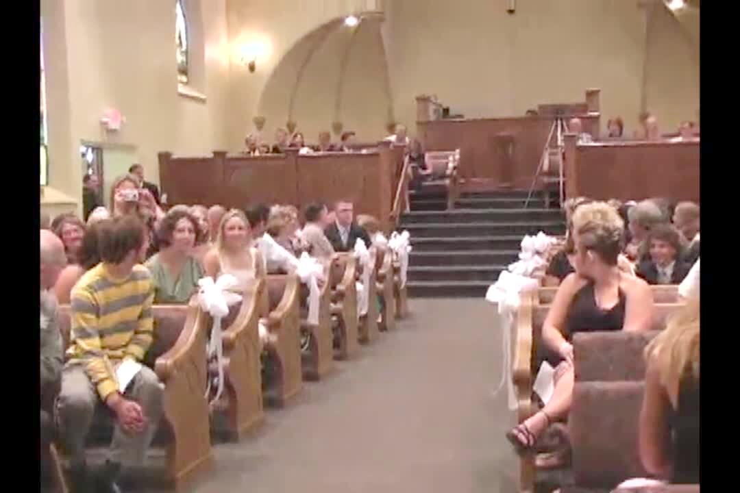 In a church, before wedding, a young flower girl runs down the aisle screaming and a bridesmaid woman picks her up at the front of the church. The entire crowd of people laugh as a young ring bearer boy and another young flower girl walk down the aisle together.