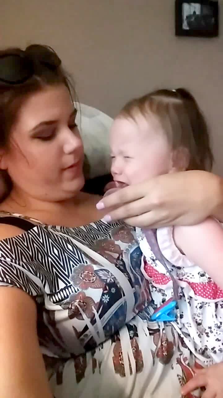 A tot girl cries after she puts her pacifier in her mother's mouth when she pretends to cry on the couch.
