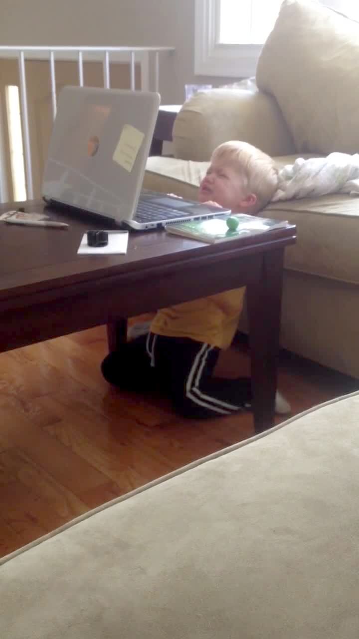 A woman tells her tot son he needs to get away from a laptop computer and he cries while he says he needs to check his email.