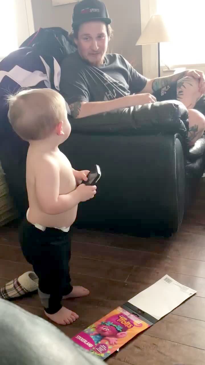 A man and his tot son argue because the man wants to watch a hockey game and the boy wants to watch Trolls but the boy speaks in baby talk and then cries.