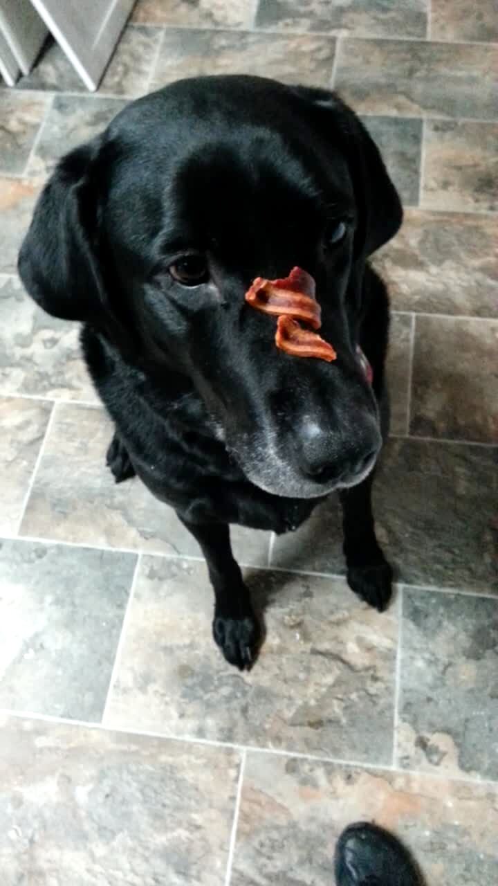 A black Lab dog sits indoors and drools as a woman puts bacon snacks on its nose and face. When the woman gives the command, the dog moves its head and the treats fall off-camera.