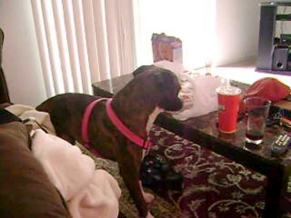 A boxer dog is getting into food on coffee table. Woman catches him and dog looks wide-eyed at camera.