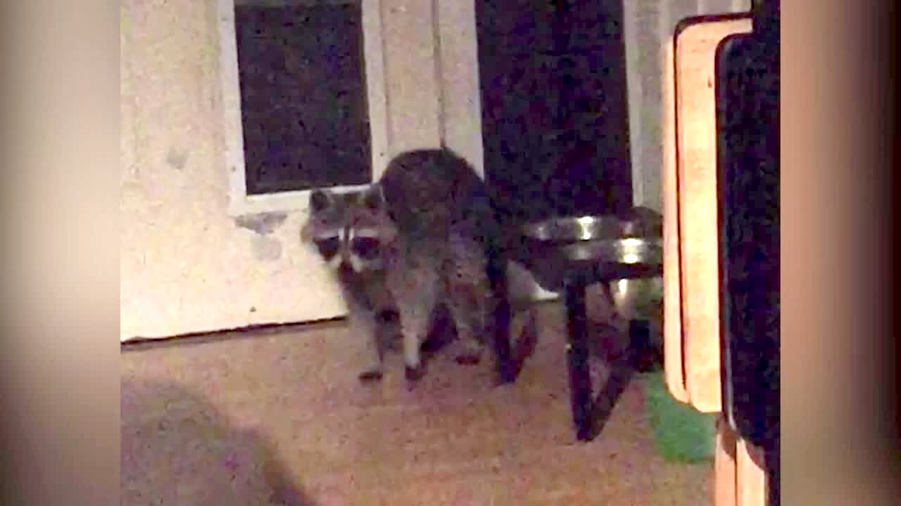 A raccoon sticks its head and one paw through an open window in a bedroom, then it pulls a bowl of cat food over to the window, and a man and woman wake up to stare at it. No audio. Security footage.