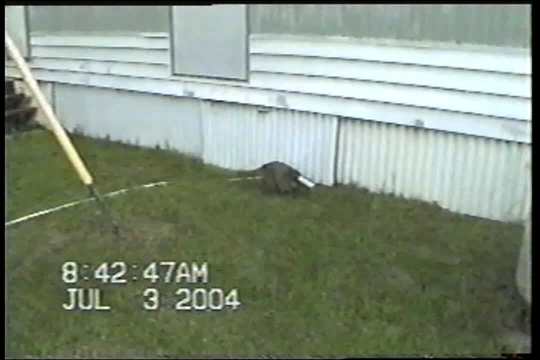 A cat shoots through a pet door. An instant later, a raccoon comes out. Security camera footage.
