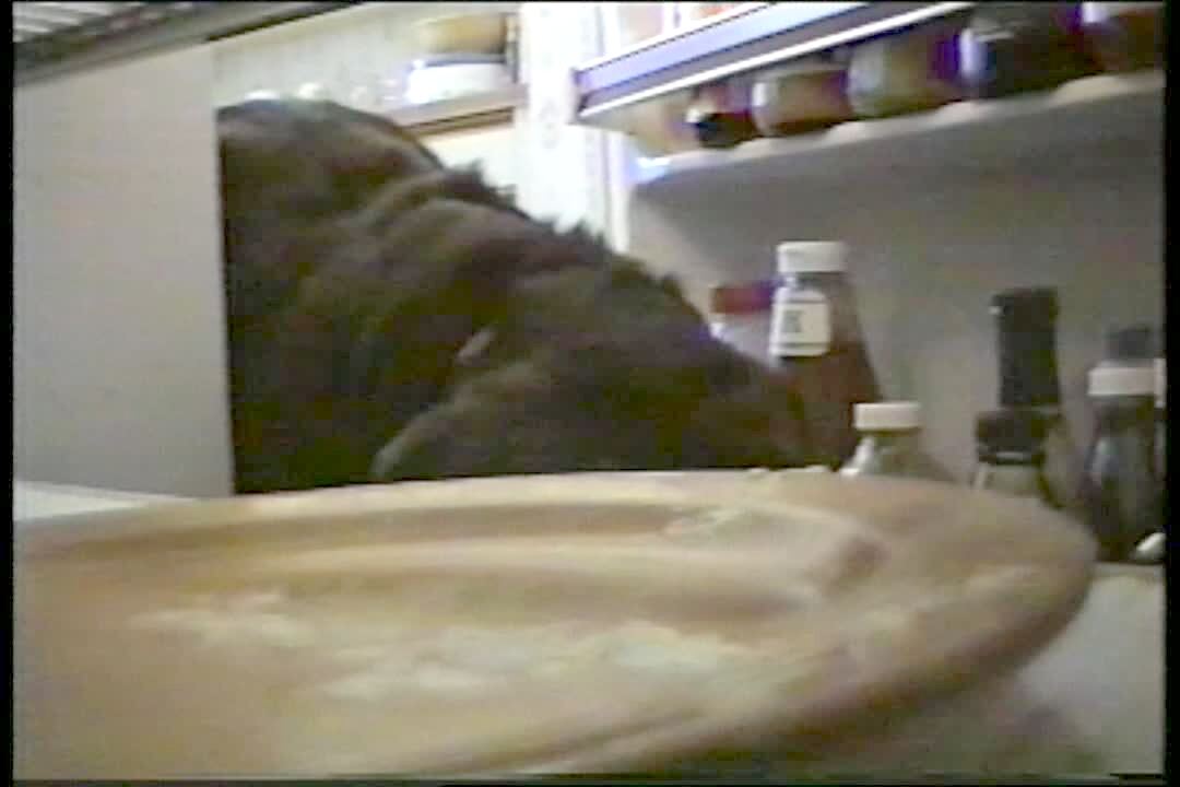 Dog opens fridge and eats off plate - one of two angles is from inside fridge. Tongue licks food right in front of lens. Hidden camera.