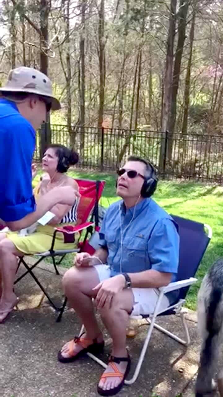 A man and woman play the whisper challenge game and find out that they are going to be grandparents outdoors. Different angle of clip #750910.