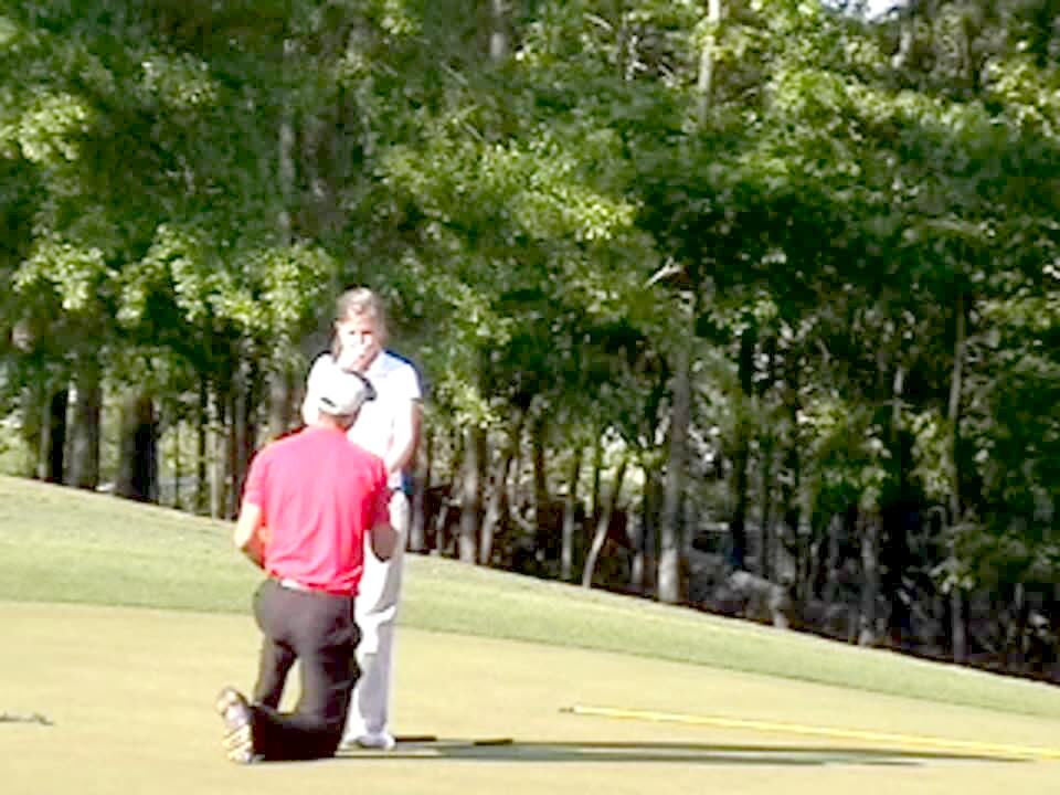 Man proposes to woman on golf course. Can't hear anything. Proposal, engagement.