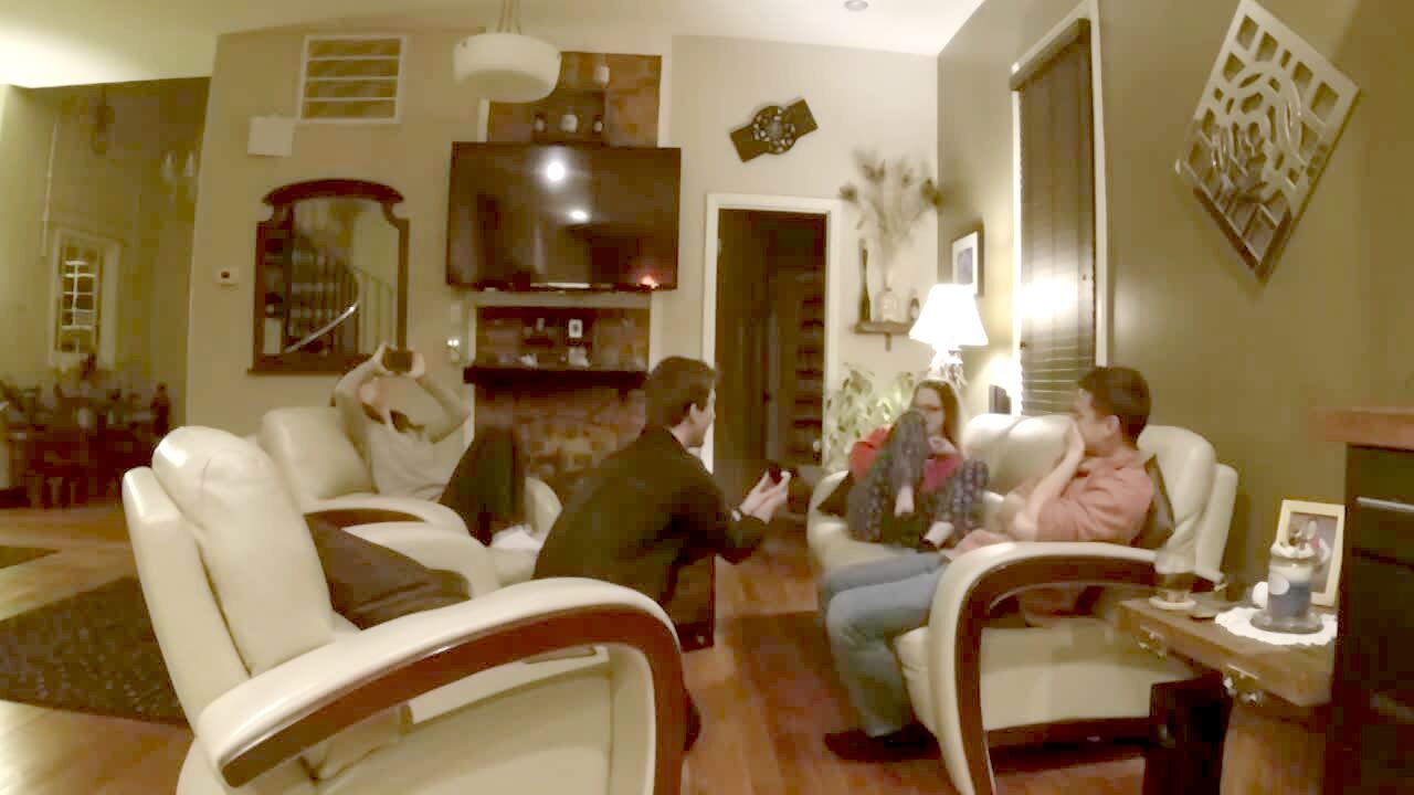 A woman and a man play the "Center of Gravity" challenge in the living room. The woman tricks the man into falling on his chest. Everyone laughs. Christmas.