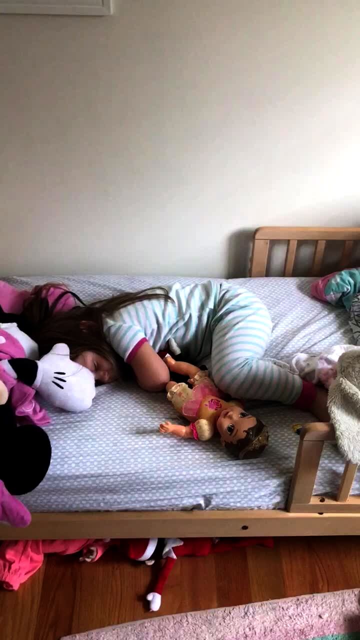 A young girl plays in her bed in her bedroom, but then lays down and pretends to sleep when her mom walks into the room. The woman asks her daughter if she's asleep and the girl shakes her head "yes."