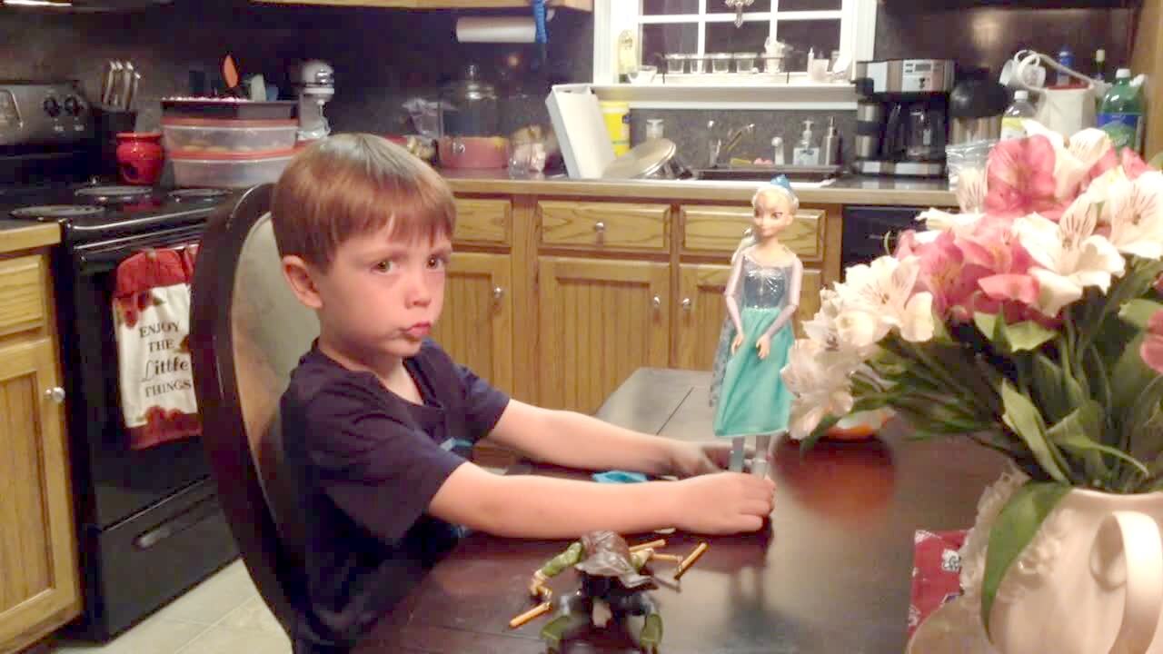 A young boy plays with a doll on a table indoors, sees the camera, and sets it down quickly. The woman recording laughs and he looks embarrassed.