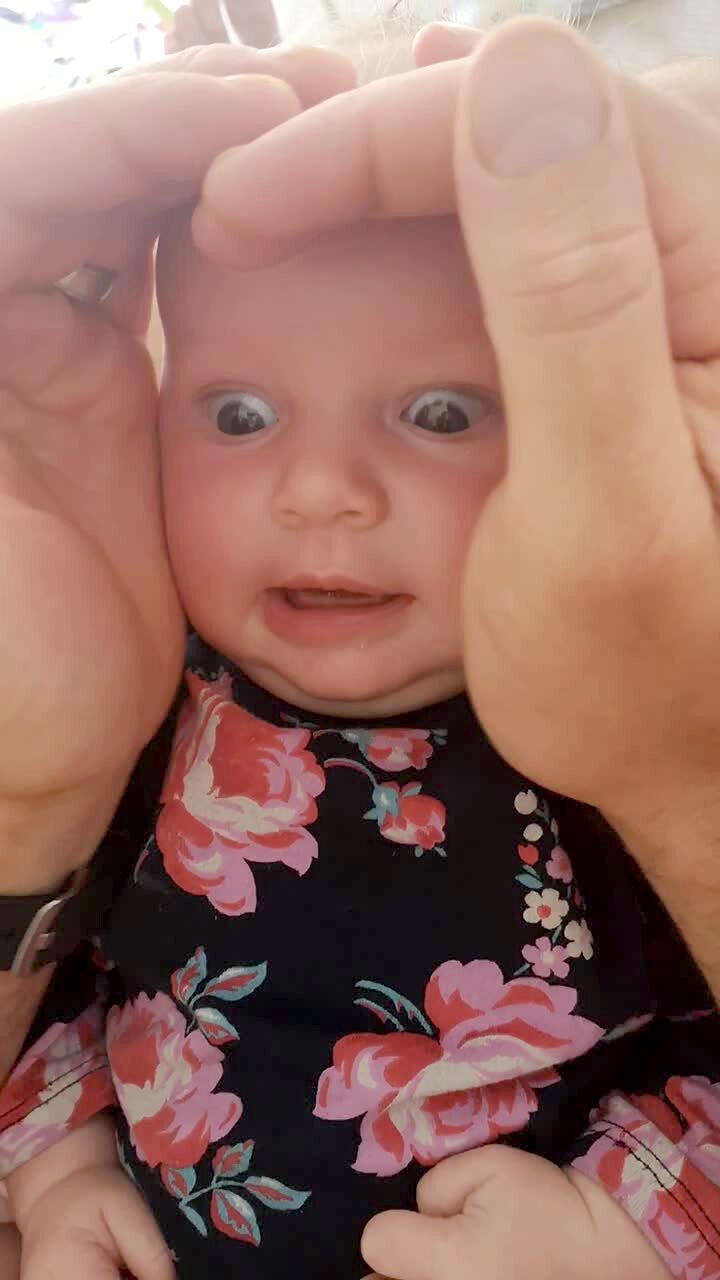 A baby girl widens her eyes every time her dad says "big eyes" and covers the sides of her face in a living room.