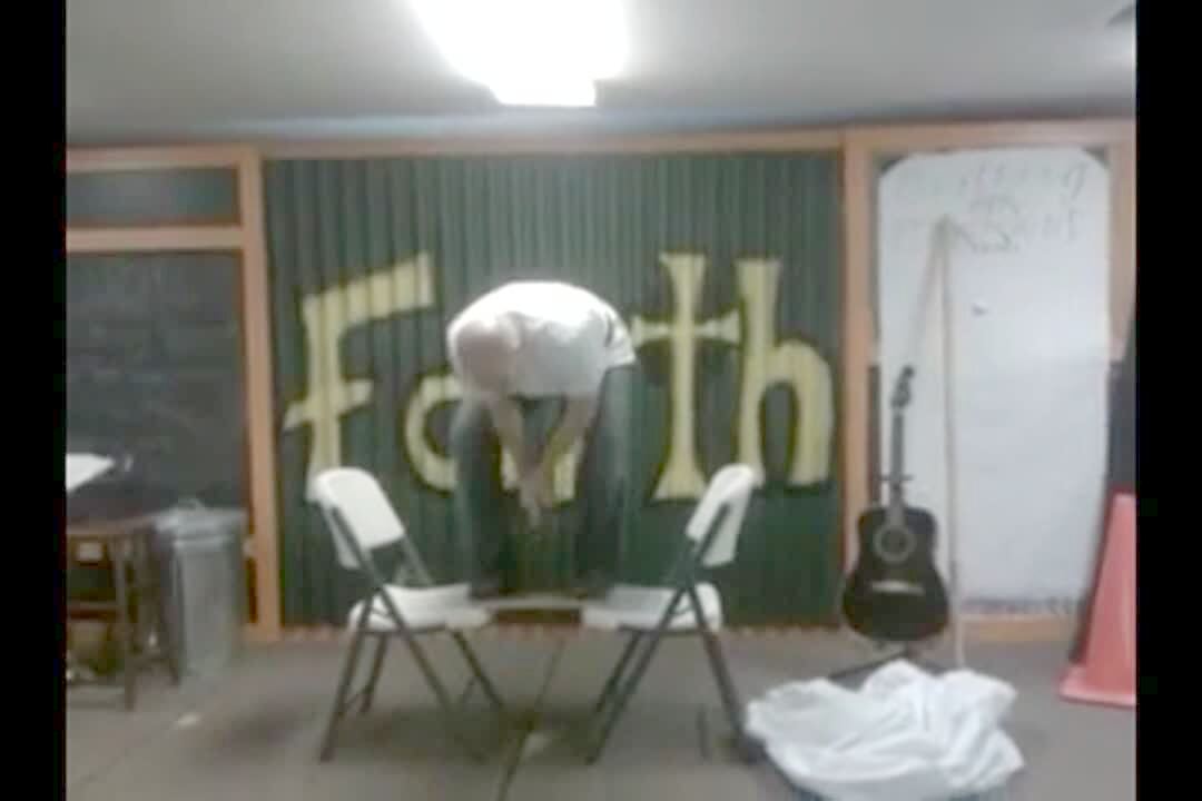 Man hangs from a doorway & slowly flips backwards but the door piece breaks. Man falls on his head. Bonehead. With recovery.