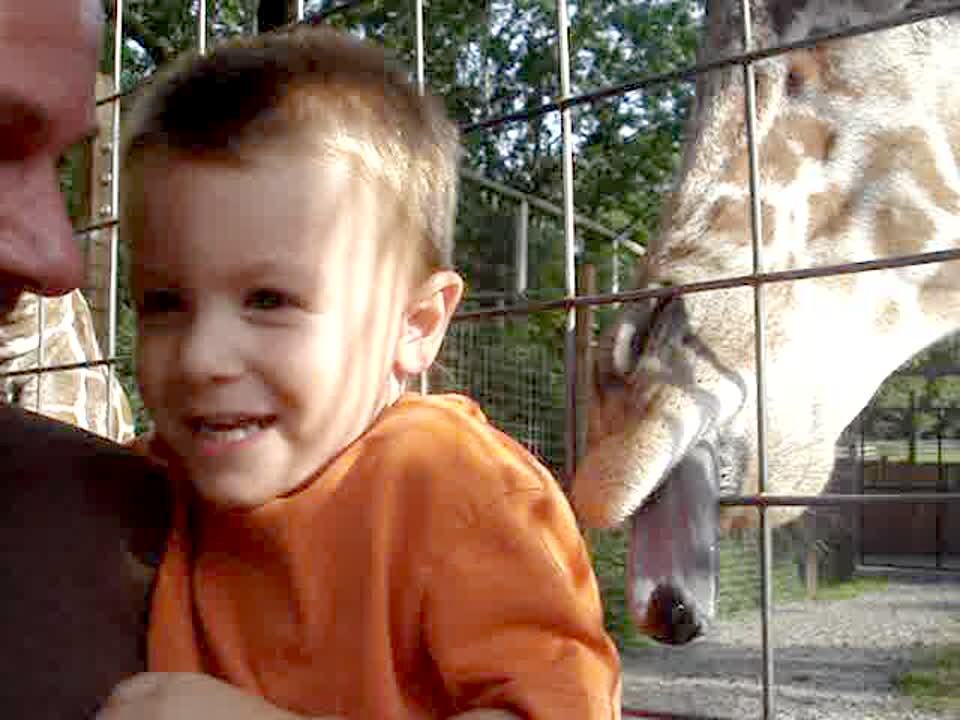 A man holds a carrot next to his tot son and makes a giraffe lick his face at the zoo.