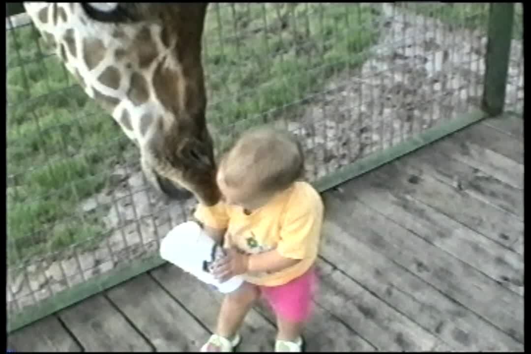 Young boys and girls feed a giraffe and a tot girl is happy to feed it, until she sees the giraffe's long tongue at a zoo.