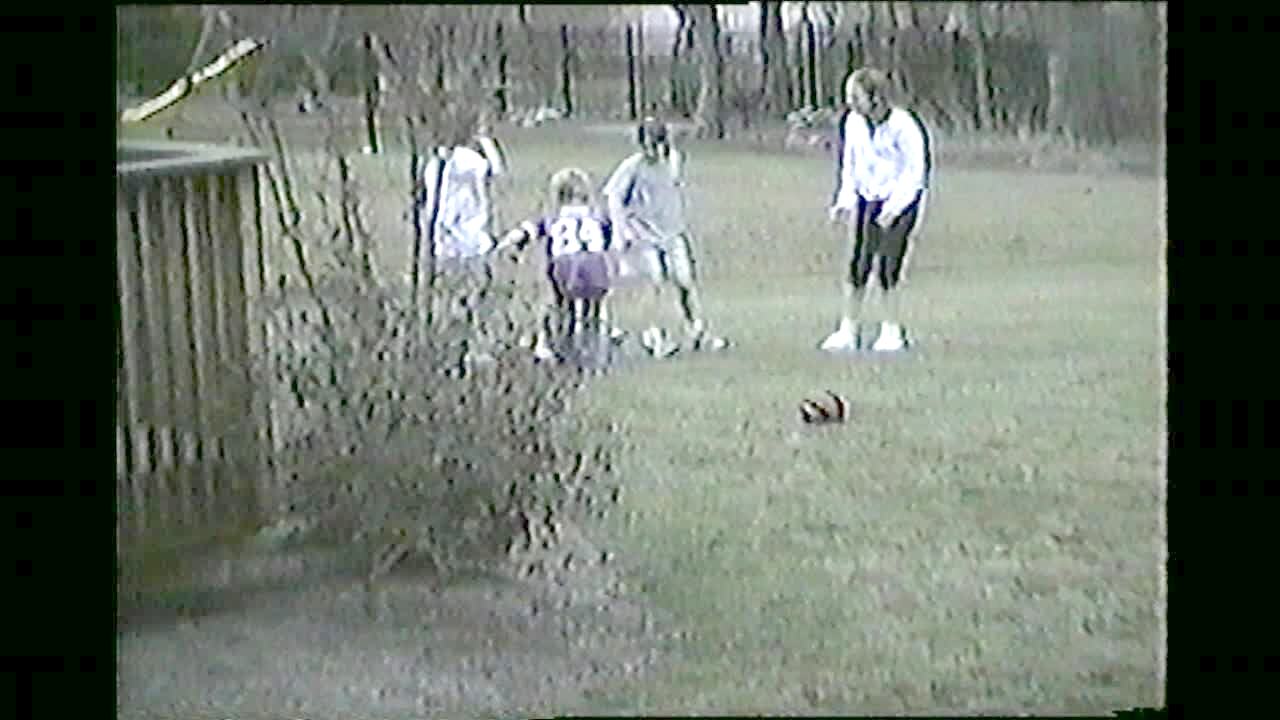 A tot girl says "kick it" repeatedly while she waits for an exercise ball. The ball comes from off camera, bounces off the wall behind the girl, and knocks her down when it hits her in the back of the head.