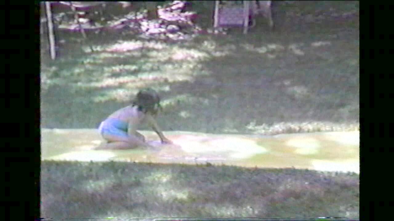 A young girl steps on a toy ball launcher in a yard. A plastic ball fires out and hits her in the face and she says "Oh my head!" and does it over and over again.