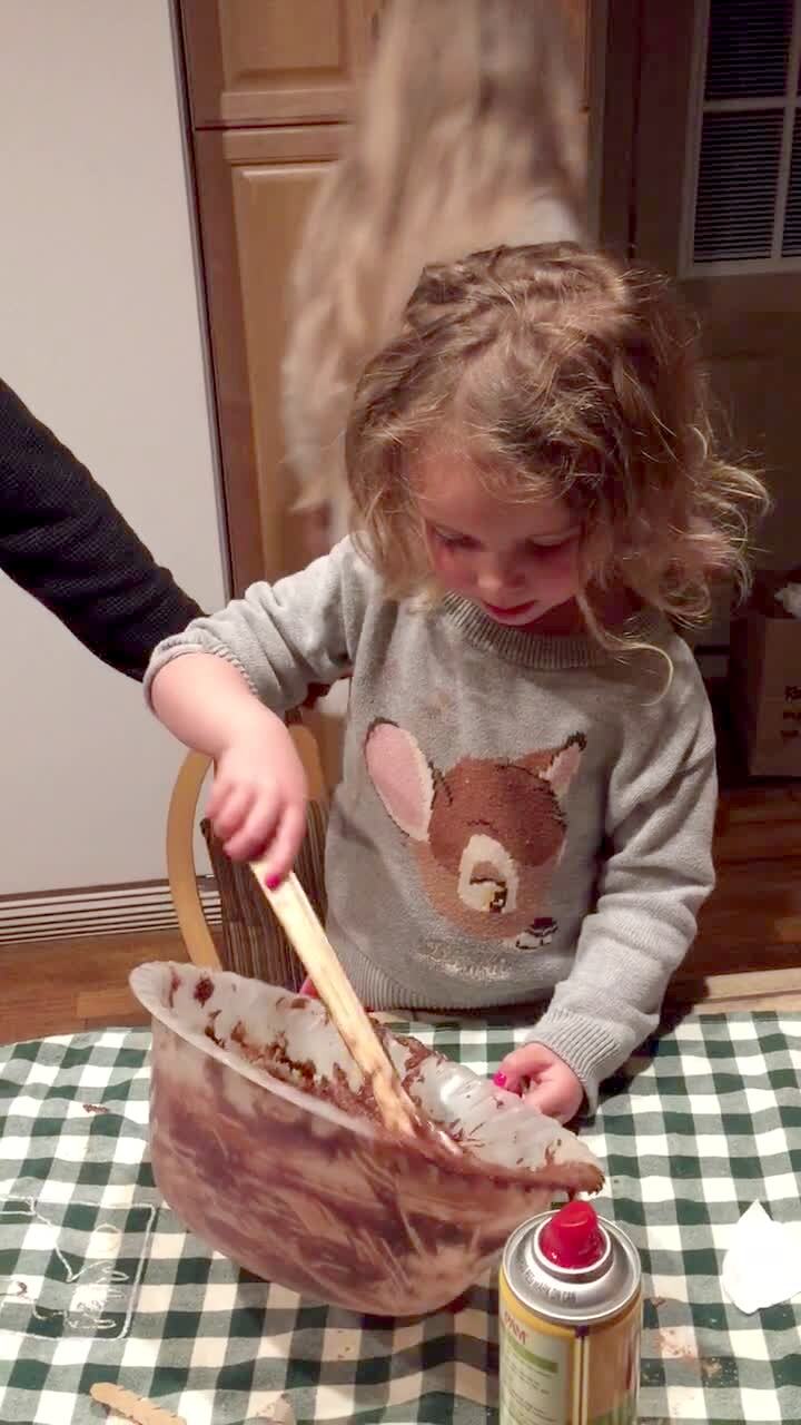 A young girl scrapes at chocolate frosting in a bowl. A man asks for a bite. She shoves the wooden spoon down his throat and he gags. Baking, cooking, kitchen