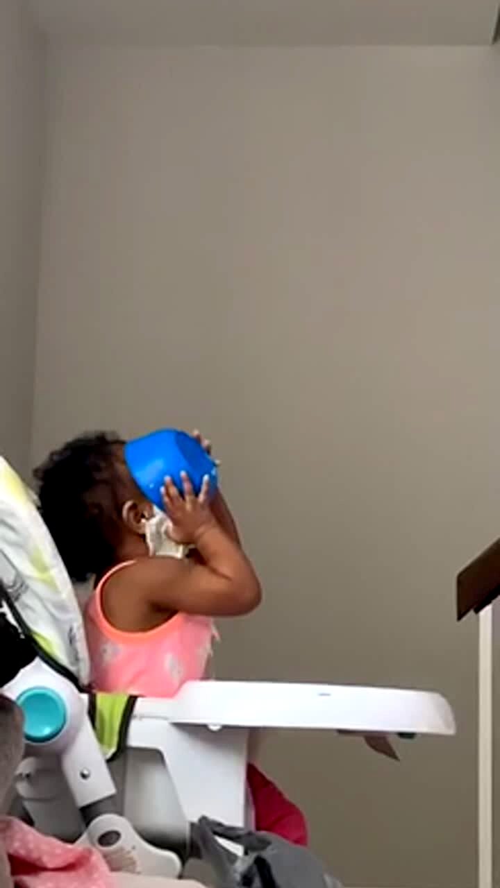 Tot girl drinks chocolate syrup from a big container on the kitchen floor. Looks like a keg stand for kids.