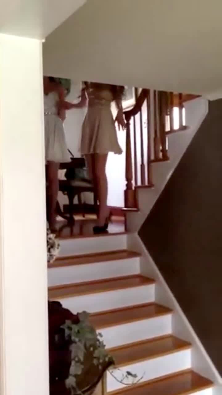 Teen girl walks down the stairs in a prom dress, gets half way down and trips. Falls the rest of the way, then gets up and smiles, thankful that she had pants on.
