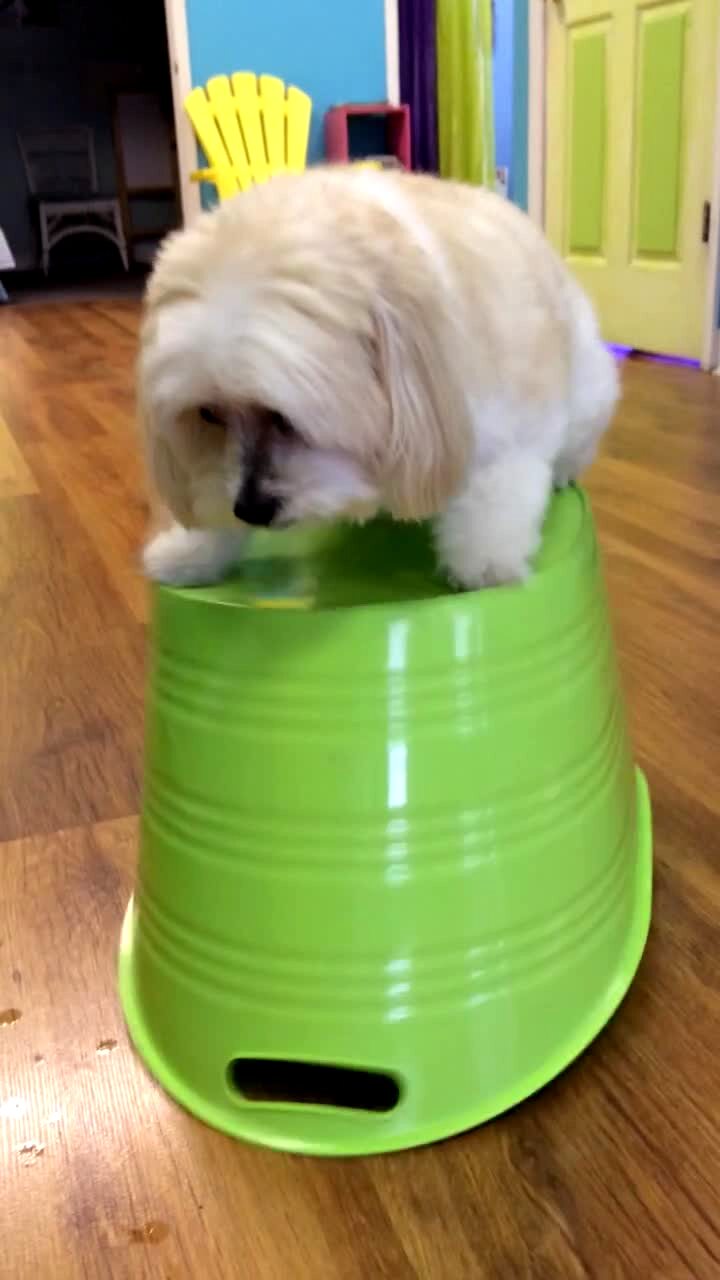 A dog is stuck inside they stand to his food bowl. He spins around several times to try to get it off. Security footage.