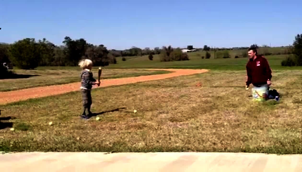 A little boy hits a baseball right back at dad who is pitching to him from his knees. Dad says "come on hit it hard" right before the pitch.