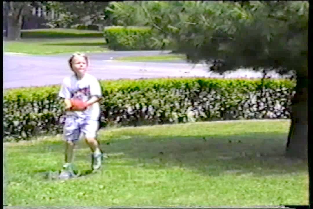 Man and boy play outside. Kid runs around dad, who throws a ball and hits his son in the head, knocking him down.