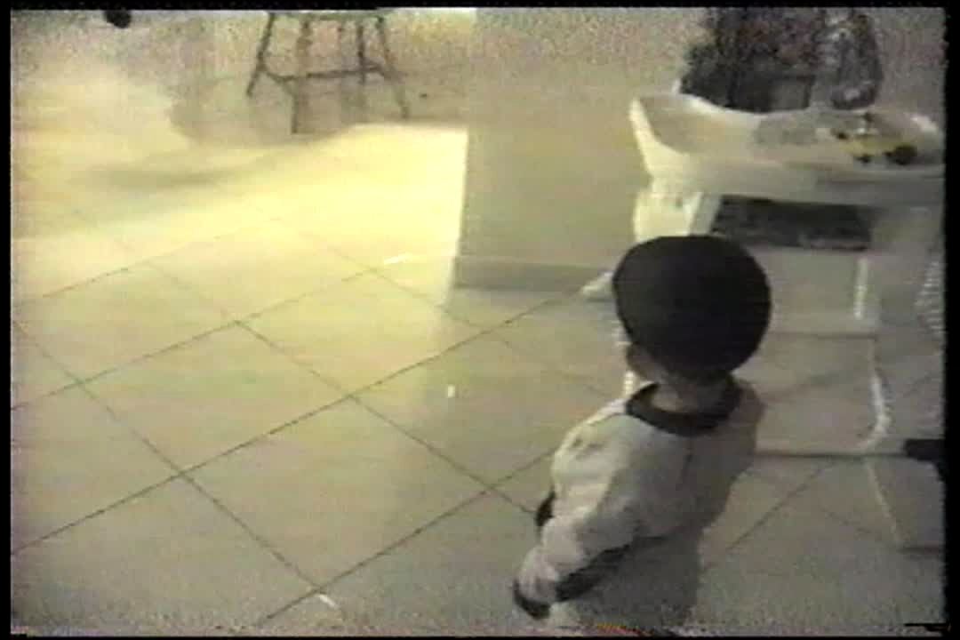 Tot boy hits ball off tee in yard, hits mom filming with bat. Baseball.
