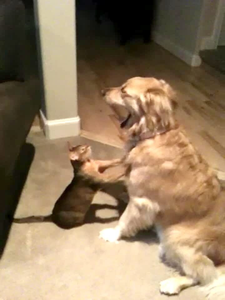 Cat kneads golden retrievers dog's chest. Look like he is hypnotizing him. Animal love.