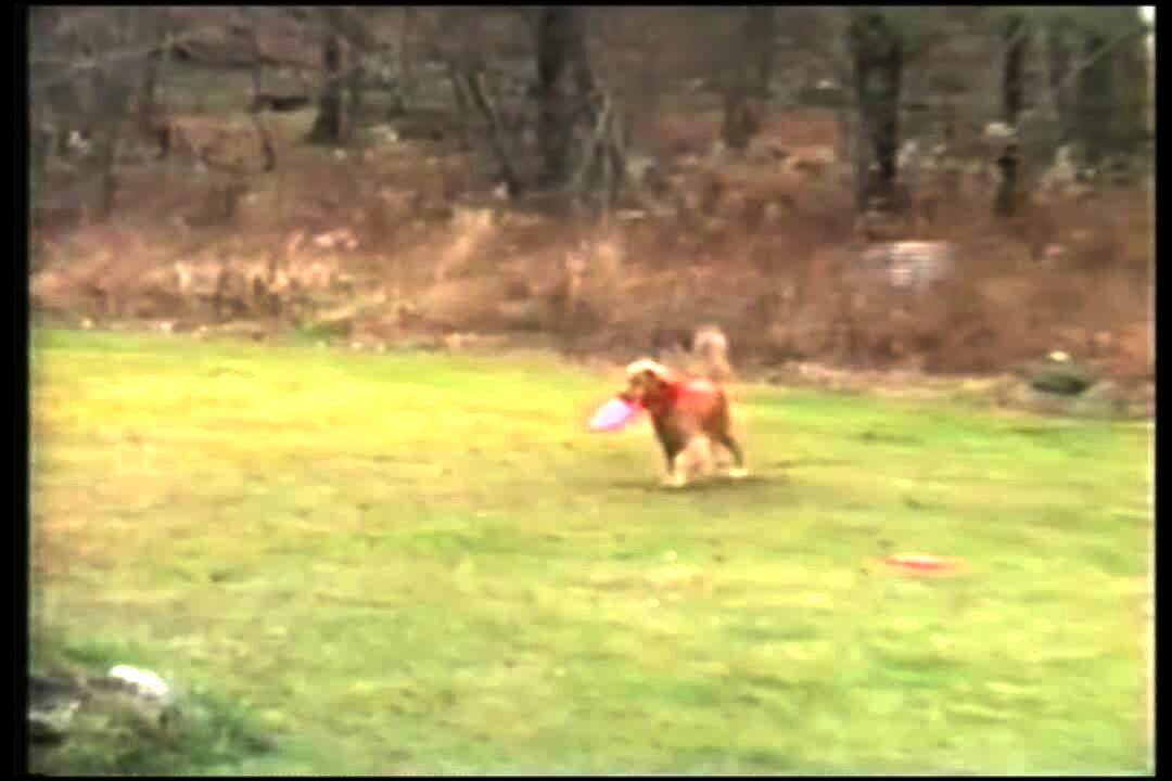 Golden retriever dog collects 6 frisbees in its mouth & brings them back to its owner when playing fetch in the backyard. Silly pet trick.