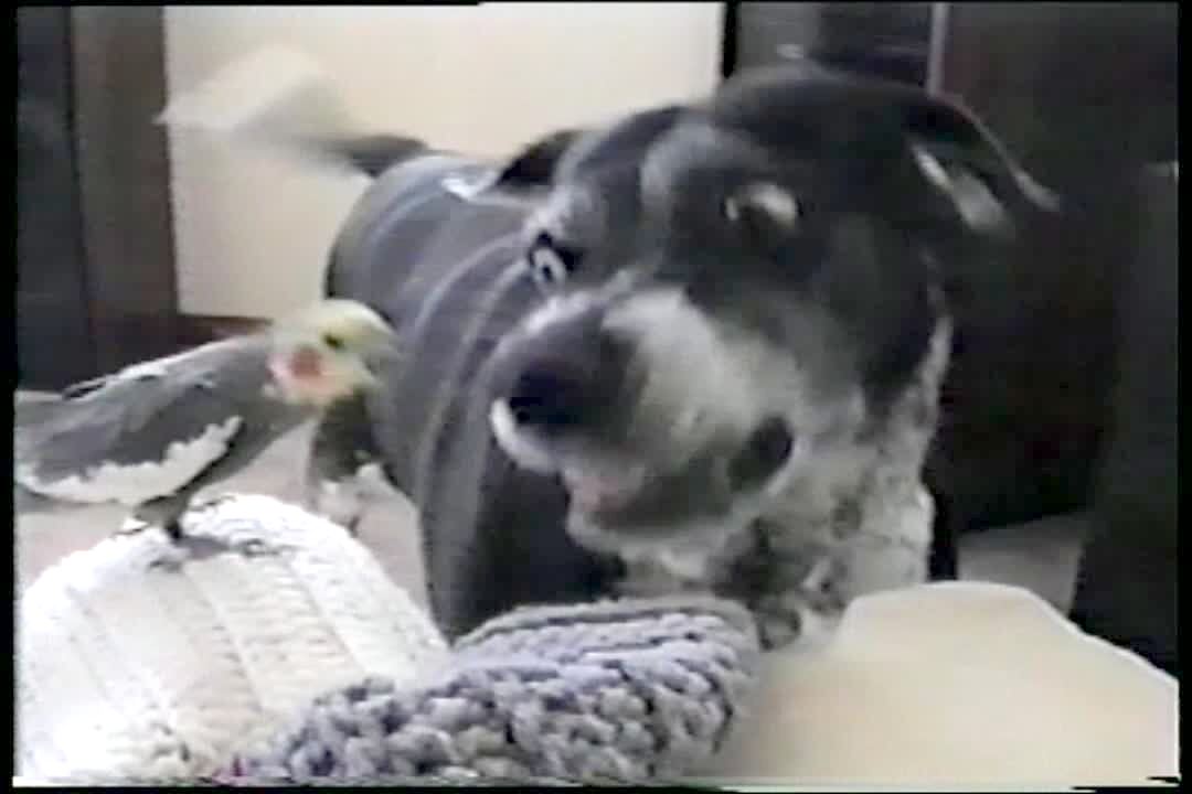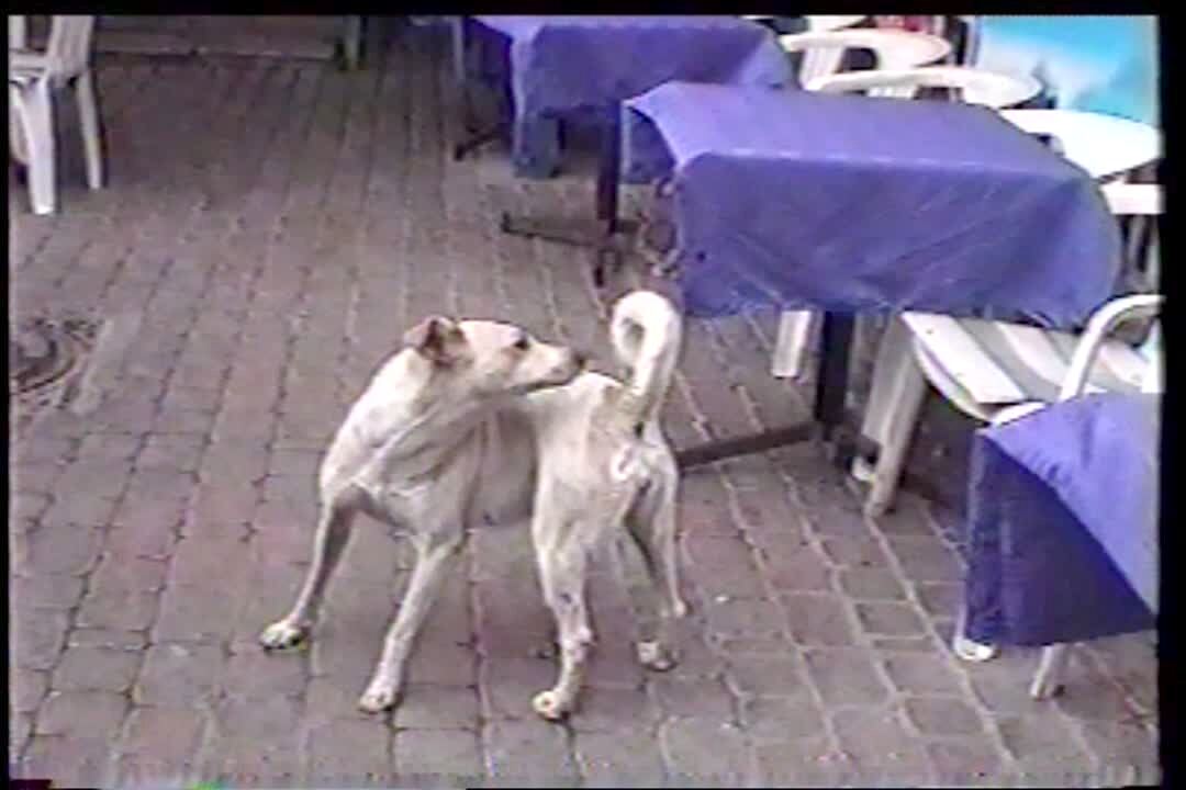 Dog looks at its tail & then suddenly bites it. Silly pet.