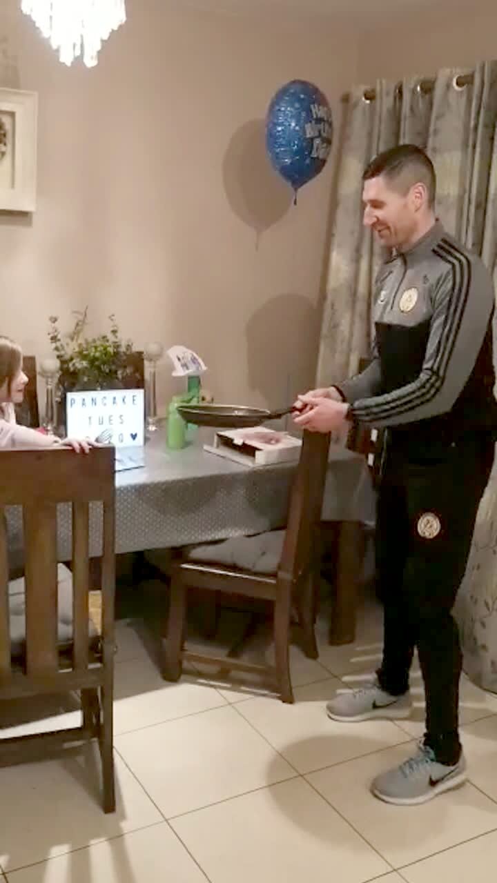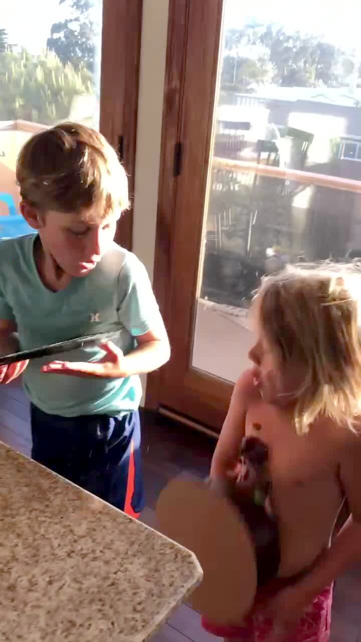 A man gets his young girls and boy to chant for him before he flips and omelette, but then the pan breaks.