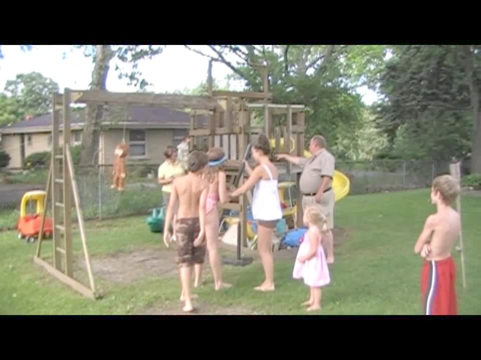 Teen girl stands behind man helping him get ready to hit pinata. He misses the pinata, hits the teen girl hard in the head with the stick. BBQ, party. Short tails.