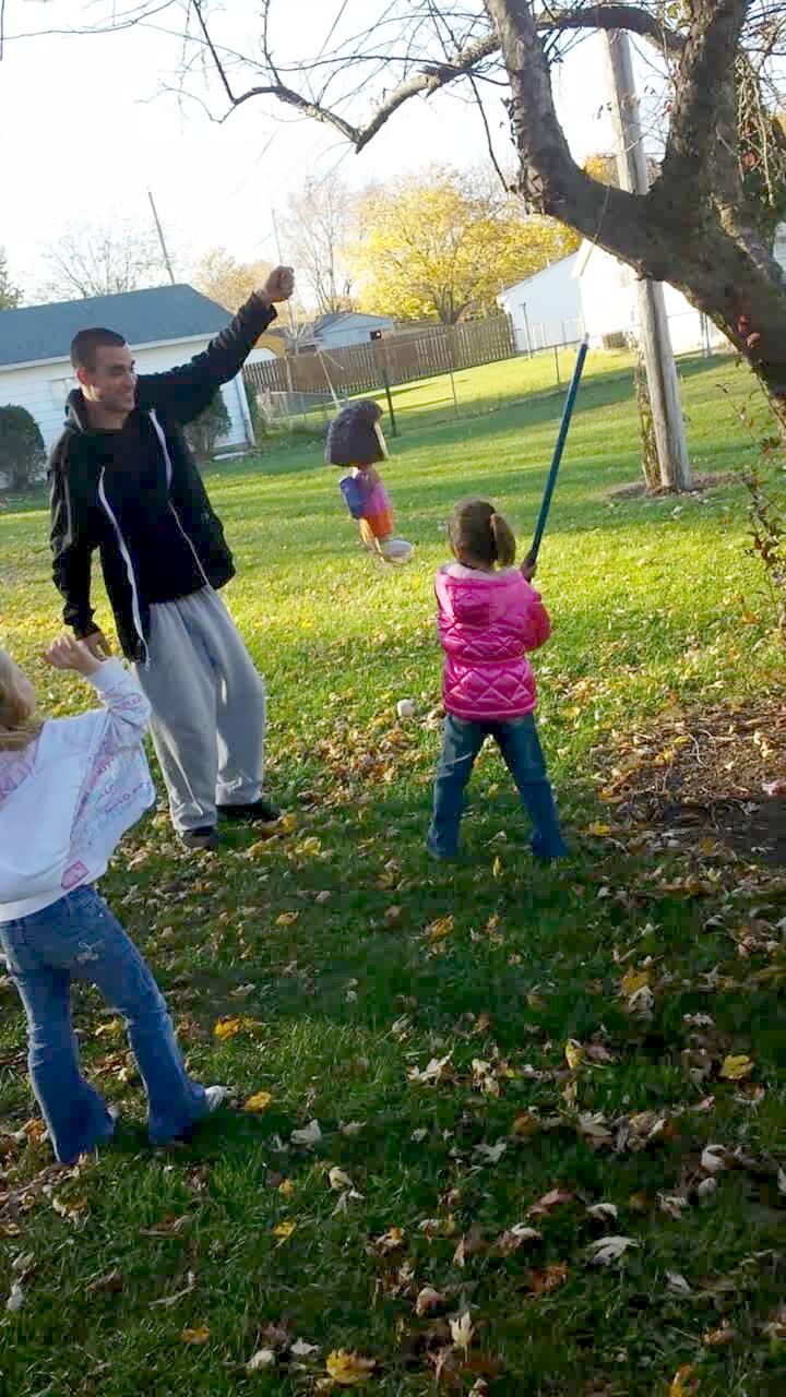 5 year old girl trying to hit pinata after being spun around. Swings and breaks something made of glass instead.