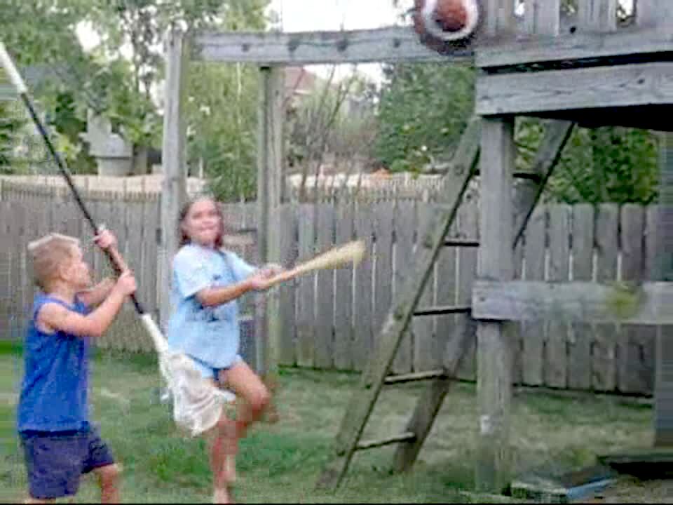 Young boy & girl take turns swinging at a pinata. Boy hits girl in the head with lacrosse stick.
