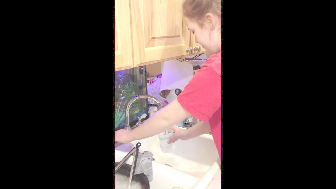 Young girl tries to fill up dog's water bowl at sink. Mom has taped the sprayer together so it goes in her face. Good reaction but bad angle, can't see the faucet. practical joke / prank