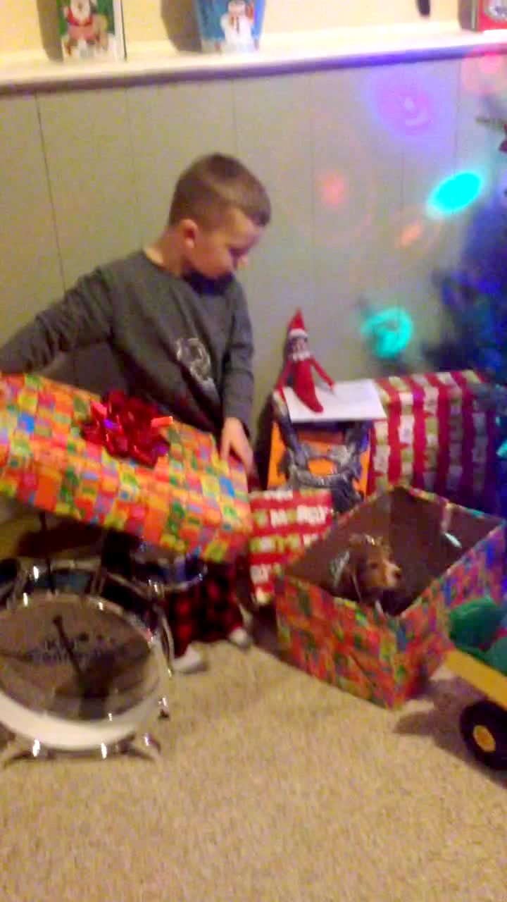 A young boy opens a Christmas gift and says "this is not a toy, I'm disappointed!"