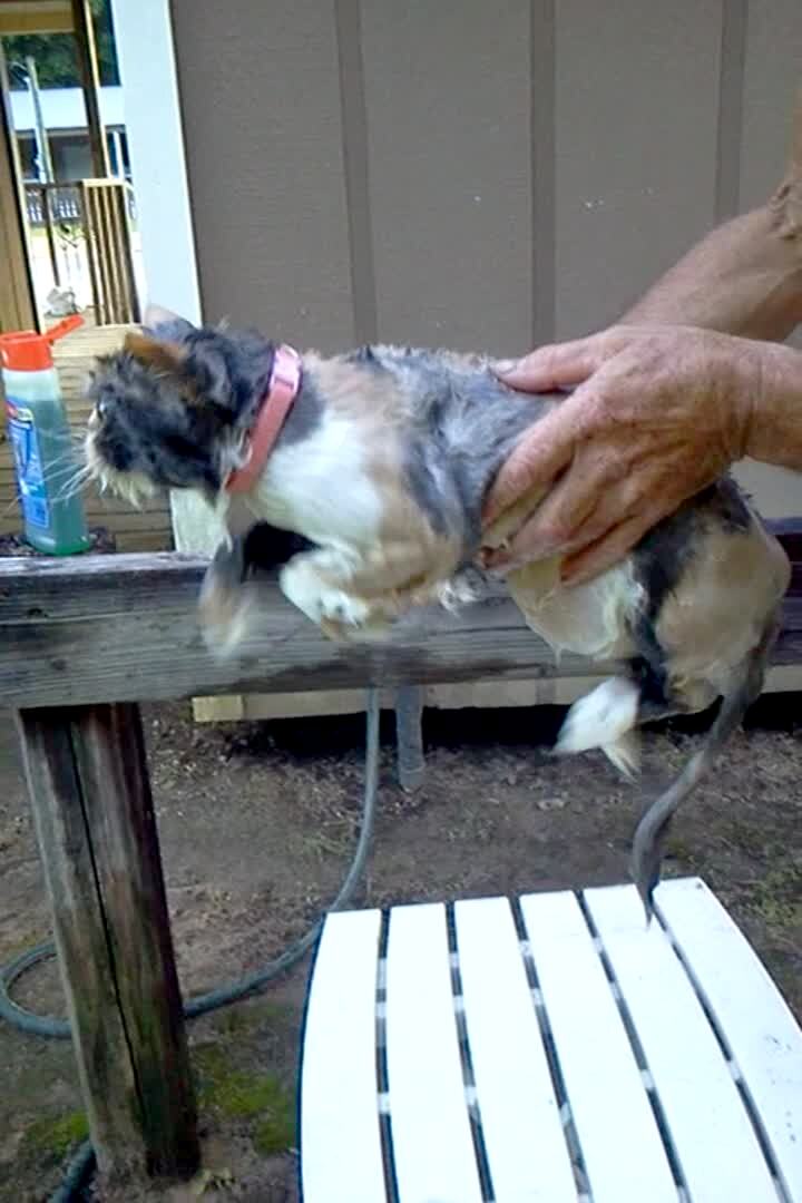 Man puts hands through a shirt with a dog's head sticking out of the neck collar and feeds the sheep dog with a spoon. Looks like a dog with human hands.