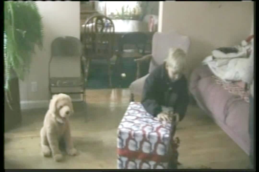 Toddler babbles to a toy parrot, which repeats the baby's babble