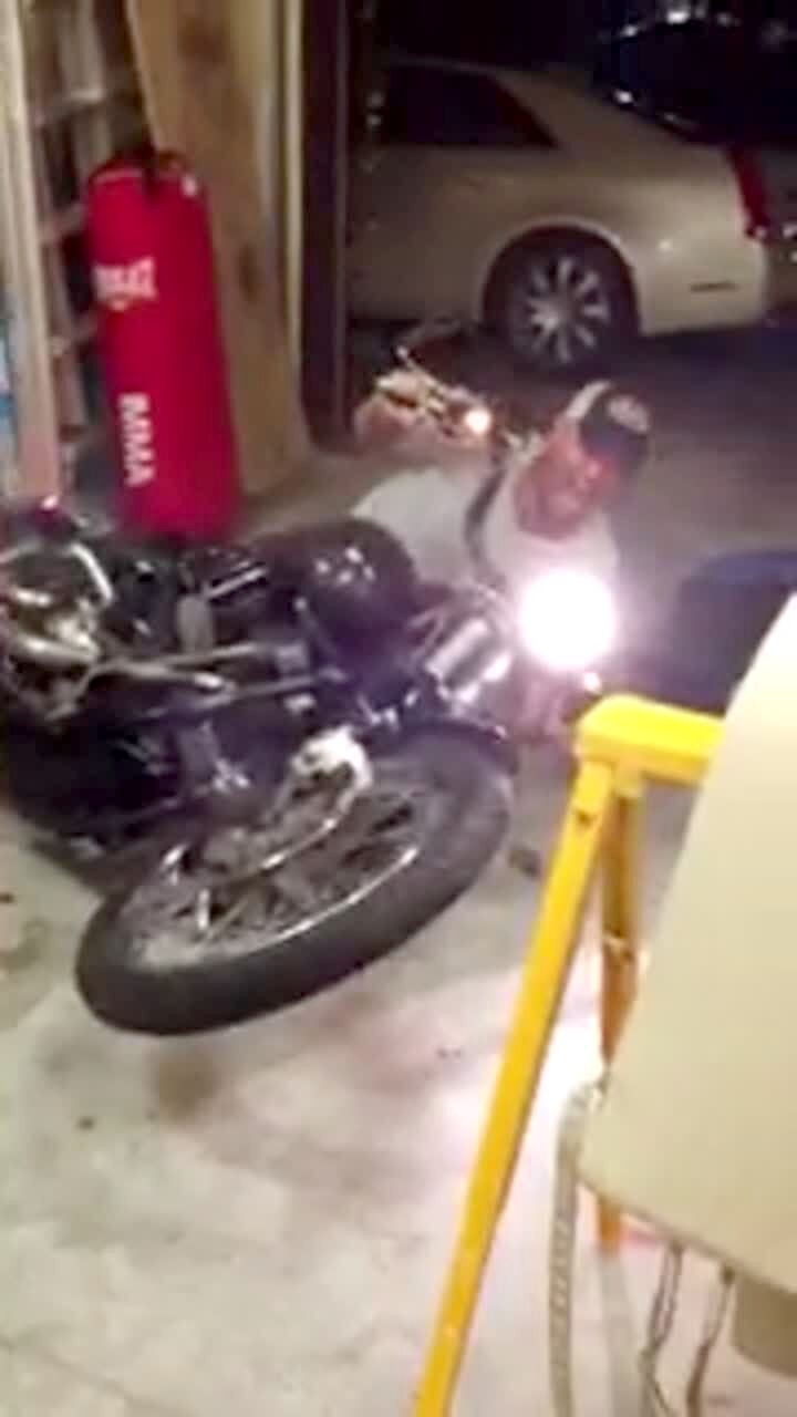 Man in a jacuzzi tries to get cockatoo to laugh. Man puts his face next to bird & makes noises, bird jumps at man's face & bites his nose. Bird falls into jacuzzi. NIGHT SHOT.