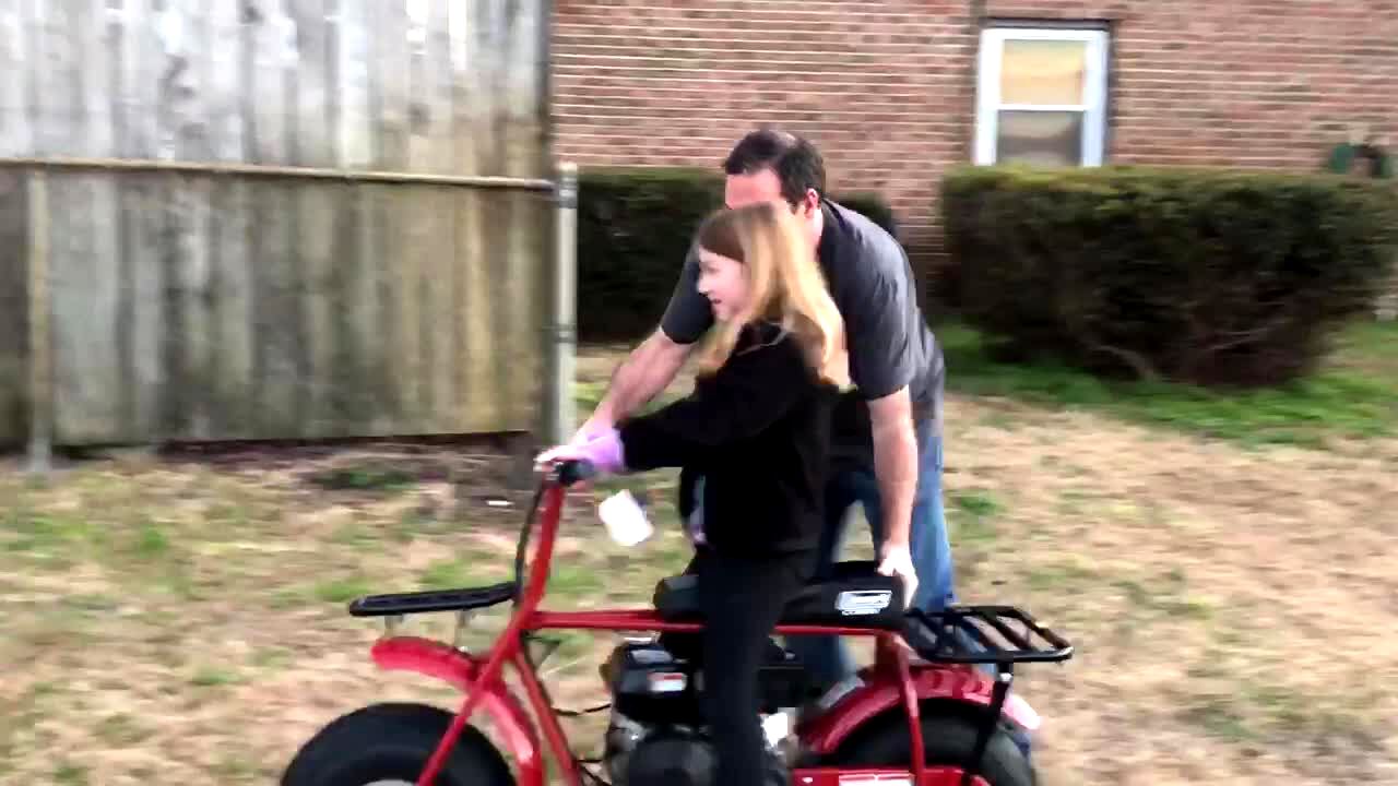 A man helps his daughter learn to drive a motor scooter around the yard. Then at 1:15, he helps his teen son drive it, but the boy speeds up and loses control. He crashes the scooter and they both fall.